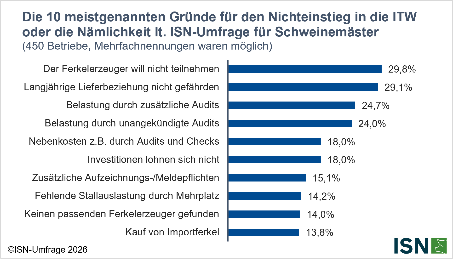 Auch wenn sie nicht ganz vorne in der Liste erscheinen, so sind ökonomische Gründe und Kostenpositionen sowohl bei den Sauenhaltern als auch bei den Schweinemästern wichtige Gründe gegen die ITW-Teilnahme. Gleiches gilt für zusätzliche Dokumentations- und Meldepflichten.