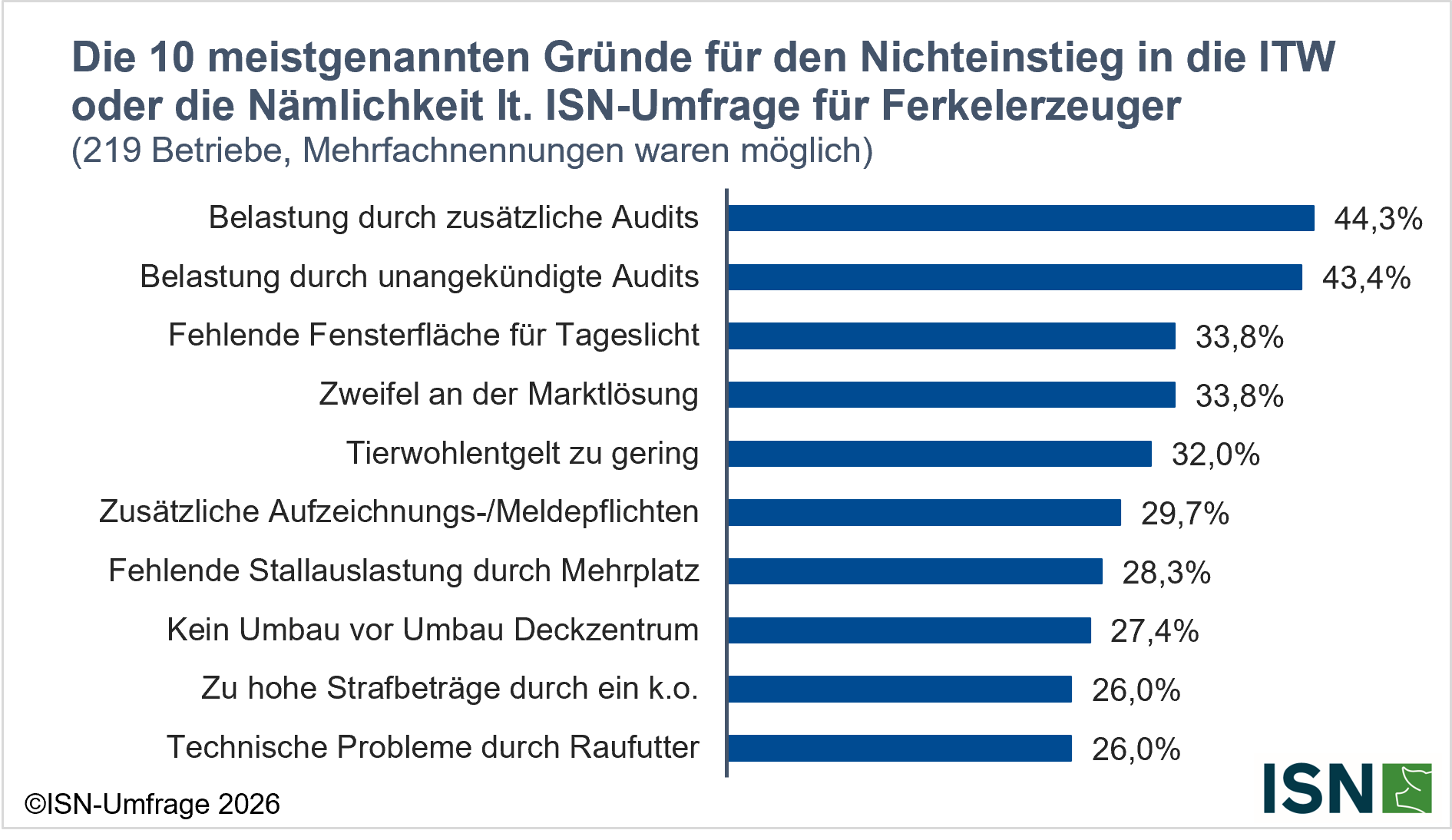 Wesentliche Gründe für die Nichtteilnahme an der ITW bzw. der Nämlichkeit sind Belastungen durch Audits, fehlende Fensterfläche, ein ungünstiges Timing vor dem Umbau der Sauenhaltung und auch ökonomische Gründe