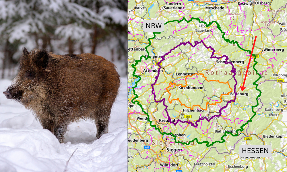 Bei Bad Berleburg wurde ein mit ASP-infizierter Frischling gefunden - die Sperrzone II wird nun ausgeweitet ©Canva, https://visualgeoserver.fli.de