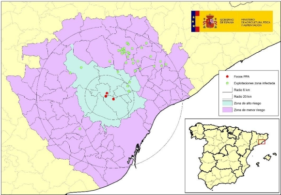 In Zusammenarbeit mit den amtlichen Veterinärdiensten Kataloniens wurde eine infizierte Zone mit einem Radius von 20 km um die ersten beiden Fundorte eingerichtet, die in eine Kernzone bzw. Hochrisikozone von 6 km und eine Pufferzone von 14 km unterteilt ist. In diesem Gebiet wurde die Jagd verboten und Such- und Fangmaßnahmen durch speziell geschultes und mit dem Gebiet vertrautes Personal intensiviert. Darüber hinaus unterstützen die örtliche Polizei und eine militärische Notfalleinheit die Bekämpfungsmaßnahmen.
